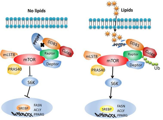 研究人員發(fā)現(xiàn)肝臟特異性敲除PPDPF的小鼠正常飼養(yǎng)32周后自發(fā)形成脂肪肝,而高脂飲食(HFD)可以加速脂肪肝的發(fā)生和發(fā)展。機(jī)制研究表明,PPDPF通過干擾Raptor和CUL4B-DDB1之間的相互作用,阻止Raptor的泛素化和活化,進(jìn)而負(fù)調(diào)控mTORC1-S6K-SREBP1信號,減少脂質(zhì)合成,抑制脂肪肝發(fā)生發(fā)展。在野生型小鼠的肝臟中特異性過表達(dá)PPDPF有效抑制了mTORC1信號通路的激活和肝臟的脂肪變性。這些結(jié)果表明,PPDPF是mTORC1在脂代謝中的新型調(diào)節(jié)因子,并為非酒精性脂肪肝病提供了治療候選靶點(diǎn)。