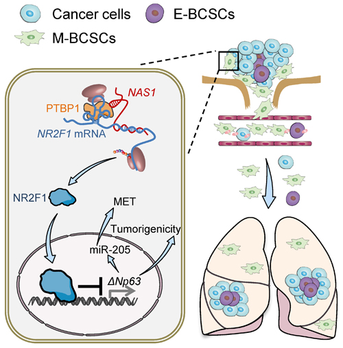 此項(xiàng)研究發(fā)現(xiàn),M-BCSC相較E-BCSC具有更強(qiáng)的從原位瘤向外播散的能力,但是播散到肺部的E-BCSC更容易快速形成轉(zhuǎn)移灶而M-BCSC則傾向于在肺部休眠。通過(guò)轉(zhuǎn)錄組測(cè)序分析發(fā)現(xiàn),長(zhǎng)鏈非編碼RNA NR2F1-AS1在休眠的M-BCSC中上調(diào)。功能研究表明NR2F1-AS1能夠通過(guò)促進(jìn)腫瘤細(xì)胞的EMT提升乳腺腫瘤細(xì)胞的M-BCSC特征從而促進(jìn)原位腫瘤細(xì)胞向外播散,同時(shí)NR2F1-AS1能夠抑制播散到肺部腫瘤細(xì)胞的E-BCSC特征從而抑制腫瘤細(xì)胞在肺部的再激活,最終促進(jìn)乳腺癌細(xì)胞的轉(zhuǎn)移休眠。病人來(lái)源的腫瘤樣本分析也證實(shí)NR2F1-AS1與腫瘤細(xì)胞干性特征和轉(zhuǎn)移休眠存在明顯的相關(guān)性。