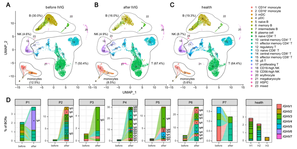 在這項(xiàng)研究中,研究人員開展了免疫球蛋白治療前后的川崎病和正常兒童的外周血單個(gè)核細(xì)胞(PBMC)單細(xì)胞轉(zhuǎn)錄組研究,揭示了川崎病發(fā)病和治療過程中外周免疫細(xì)胞及其亞型的動(dòng)態(tài)變化(圖A-C)。分析結(jié)果顯示,治療前川崎病的單核細(xì)胞和B細(xì)胞比例明顯高于治療后及健康對(duì)照,而治療前川崎病的T細(xì)胞和NK細(xì)胞比例明顯低于治療后及健康對(duì)照。與獨(dú)立樣本的流式細(xì)胞臨床檢測(cè)結(jié)果進(jìn)行比較證明,單細(xì)胞轉(zhuǎn)錄組研究結(jié)果較好地反應(yīng)了川崎病免疫細(xì)胞的變化。
