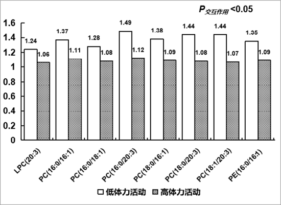 圖3. 根據(jù)體力活動(dòng)水平對(duì)血漿甘油磷脂與新發(fā)糖尿病間關(guān)聯(lián)關(guān)系進(jìn)行分層分析