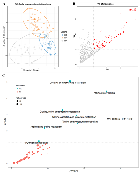 圖2 餐后2小時血液代謝組指標變化的PLS-DA和通路分析