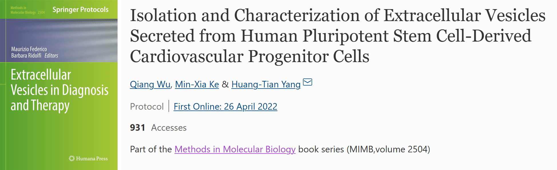 2022年4月26日,Springer Nature出版的Methods in Molecular Biology系列叢書Extracellular Vesicles in Diagnosis and Therapy在線發(fā)表了中國科學(xué)院上海營養(yǎng)與健康研究所楊黃恬研究組題為“Isolation and Characterization of Extracellular Vesicles Secreted from Human Pluripotent Stem Cell-Derived Cardiovascular Progenitor Cells”的工作。該工作介紹了從人多能干細(xì)胞源心血管前體細(xì)胞(hPSC-CVPCs)條件培養(yǎng)基中高效分離細(xì)胞外囊泡(EVs)及其特征鑒定的方法。