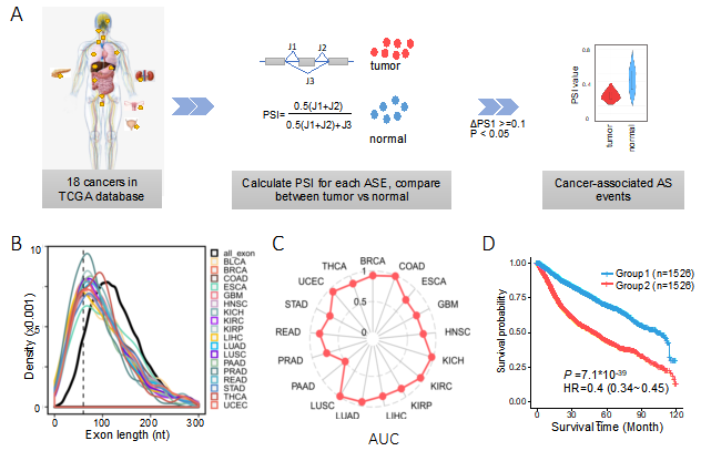 圖注:A.基于TCGA數(shù)據(jù)庫中18種癌癥鑒定癌癥相關(guān)的剪接事件流程。B.所有人類外顯子和每種癌癥類型中異常剪接外顯子的長度分布圖。C.利用剪接建立隨機森林模型在每種癌癥類型中的AUC值。D.基于CASE評估的風(fēng)險因子進行分組的癌癥患者的Kaplan-Meier曲線。