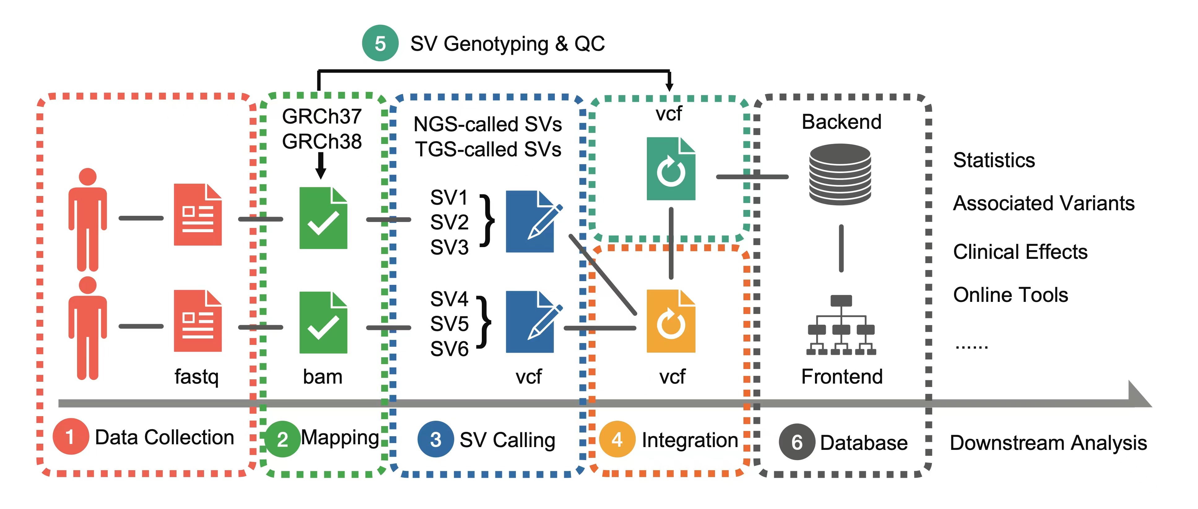 基因組結(jié)構(gòu)變異(SVs)主要包括基因組上大片段的DNA缺失、插入、片段重復等變異類型,大量研究表明SV與癌癥、自閉癥、神經(jīng)發(fā)育障礙等多種復雜遺傳病有關(guān),近年來在醫(yī)學和遺傳學領域中持續(xù)受到關(guān)注。隨著基因組測序技術(shù)的進步和普及,大量的結(jié)構(gòu)變異被不斷發(fā)現(xiàn)和研究,一些具有強致病性的結(jié)構(gòu)變異也逐漸得到驗證。研究團隊旨在通過構(gòu)建一個具有代表性、多樣性的健康人群基因組結(jié)構(gòu)變異數(shù)據(jù)集,一方面為遺傳病患者的結(jié)構(gòu)變異研究提供可靠的對照樣本,另一方面對變異功能的注釋和預測,也將有效縮小致病性突變的篩選范圍,為相關(guān)領域研究者提供有效的指導和幫助。