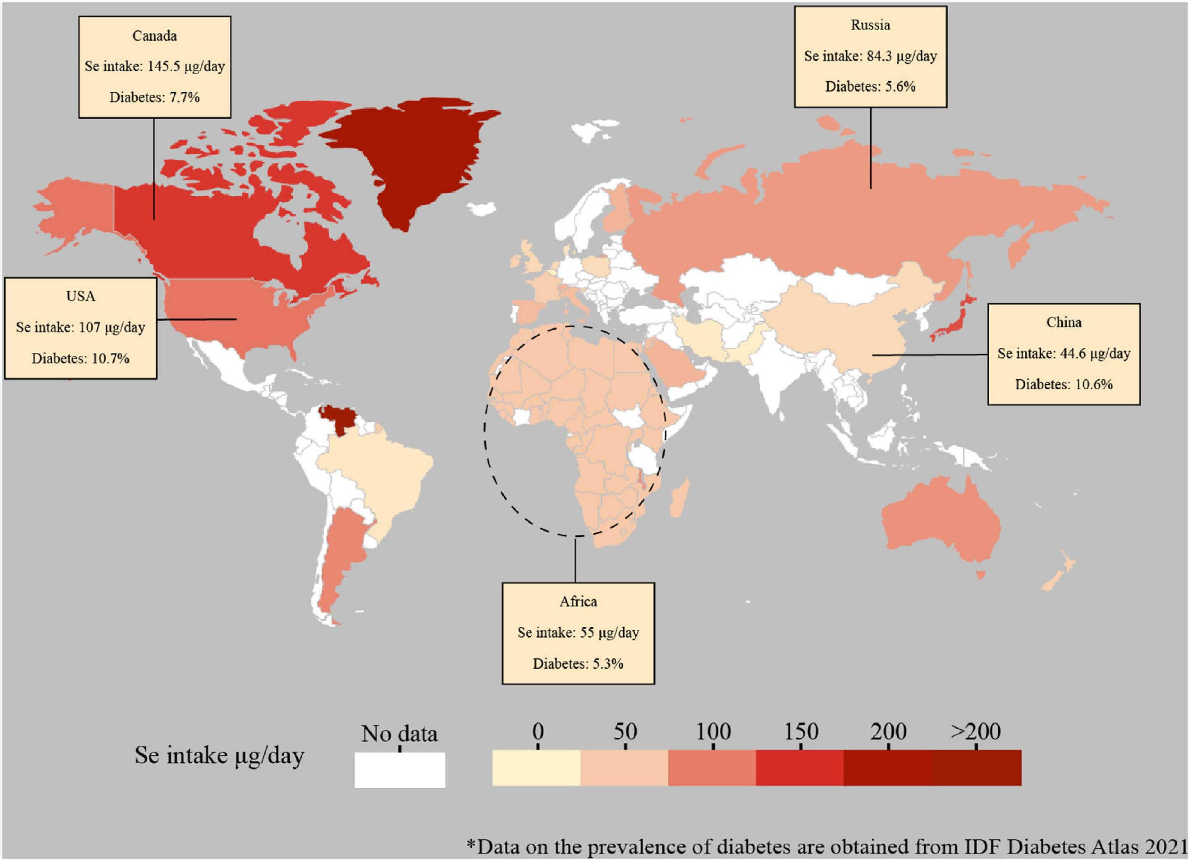 圖注:全球硒攝入數(shù)據(jù)來源于已發(fā)表文獻(xiàn),其中,中國的硒攝入數(shù)據(jù)以中國大陸的數(shù)據(jù)為代表,非洲的硒攝入數(shù)據(jù)引用自非洲每日硒供給數(shù)據(jù)。糖尿病發(fā)病率數(shù)據(jù)截至2021年,數(shù)據(jù)來源于IDF網(wǎng)站(數(shù)據(jù)鏈接https://diabetesatlas.org/data/en/indicators/2/)。圖中邊界線不嚴(yán)格代表國家/區(qū)域。