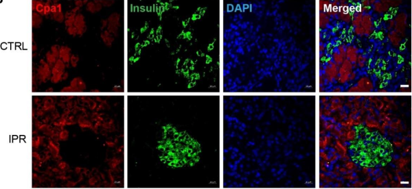 圖:兩組大鼠的胰島免疫熒光染色,間歇性蛋白限制有助于增加胰島形態(tài)完整性