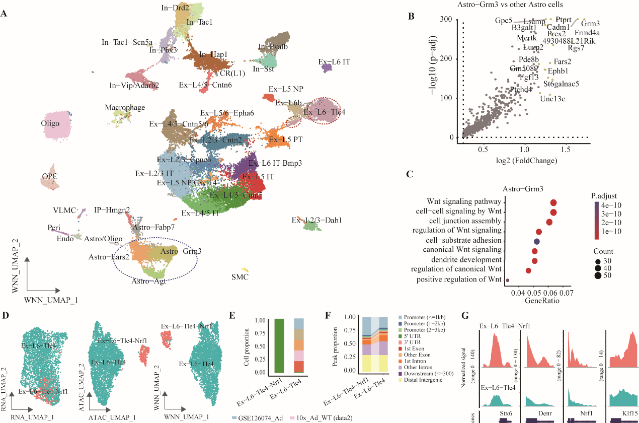 圖2?整合單細胞多模態(tài)組學(xué)數(shù)據(jù)尋找新細胞亞群。A、整合單細胞多模態(tài)組學(xué)數(shù)據(jù)解析小鼠大腦皮層細胞亞群。B-C、Astro-Grm3特異性Wnt信號通路。D-G、解析數(shù)據(jù)發(fā)現(xiàn)細胞亞群EX-L6-Tle4-Nrf1。