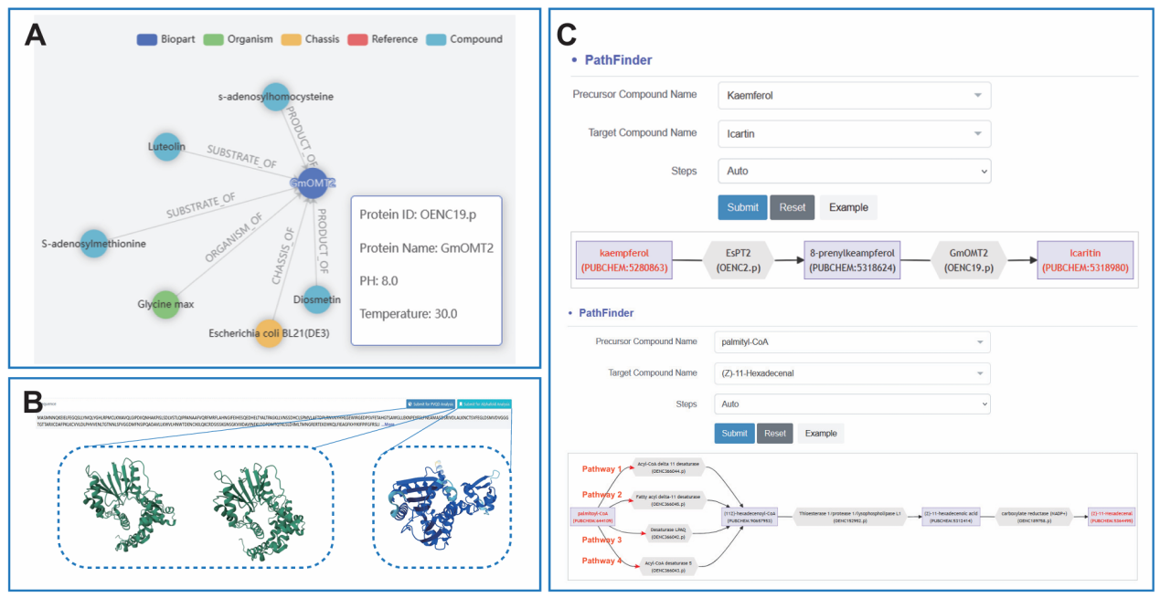 圖2:RDBSB在線分析和設(shè)計功能。(A)GmOMT2的MapView示例。視圖提供催化元件、底盤、物種和化合物之間的關(guān)系。(B)利用PVQD和AlphaFold對GmOMT2進行三維構(gòu)象和結(jié)構(gòu)預(yù)測。(C)PathFinder復(fù)現(xiàn)人工生物合成途徑設(shè)計的實例:酵母中晚期肝細(xì)胞癌治療藥物淫羊藿素的人工合成途徑和棉鈴蟲性信息素的人工合成途徑。