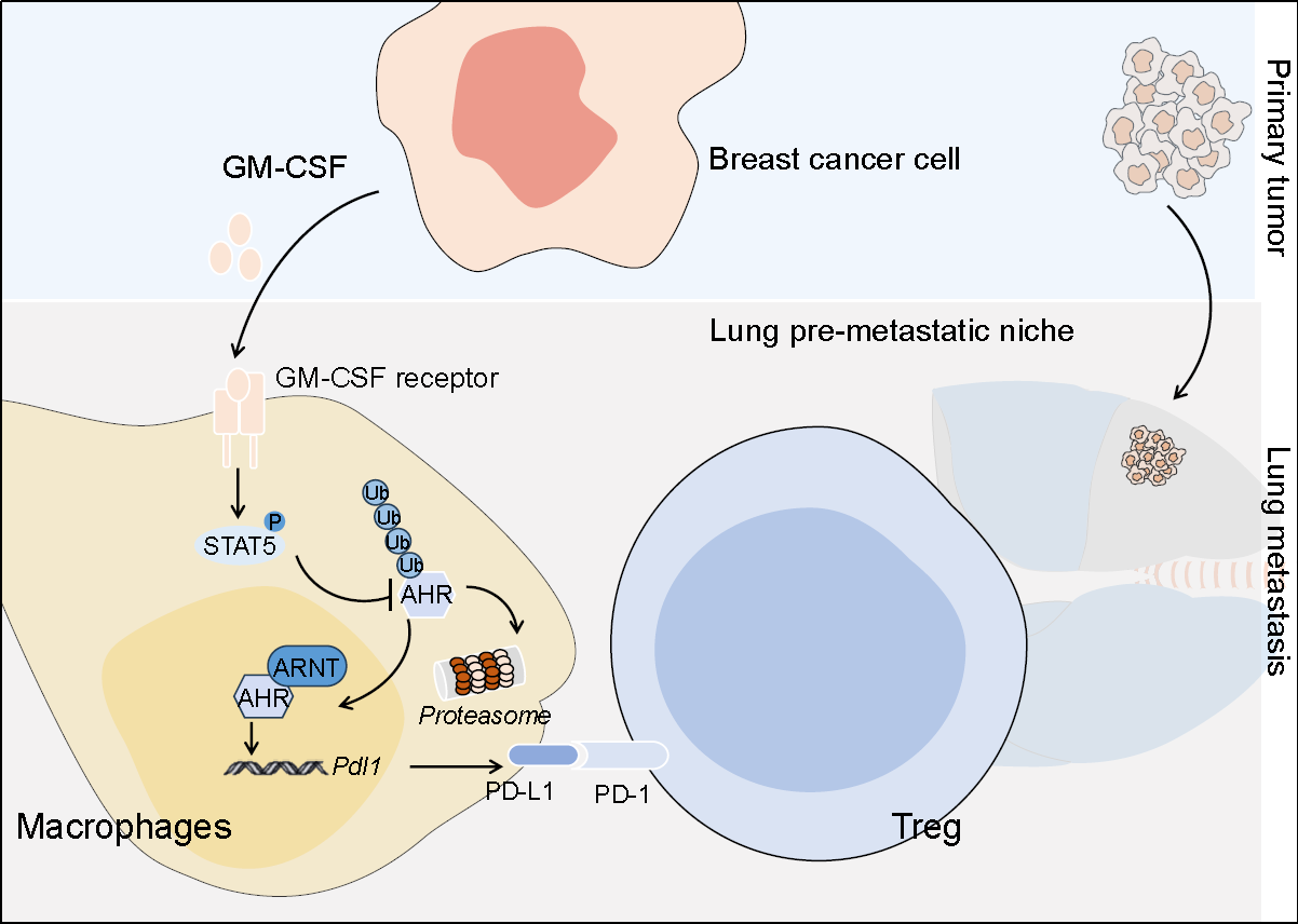 圖:乳腺癌細(xì)胞釋放GM-CSF調(diào)控肺臟巨噬細(xì)胞AHR信號,塑造轉(zhuǎn)移前免疫抑制微環(huán)境,促進(jìn)乳腺癌細(xì)胞的肺部定植與生長