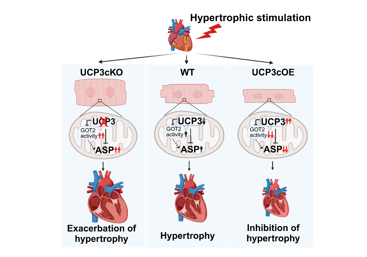 病理性心肌肥厚是高血壓、主動脈狹窄等壓力超負(fù)荷性心臟疾病的重要病理特征,伴隨著線粒體蛋白異常表達(dá),代謝重塑及三羧酸循環(huán)中間產(chǎn)物的異常變化。然而,在心肌肥厚過程中,線粒體膜蛋白調(diào)控三羧酸循環(huán)中間產(chǎn)物的分子機(jī)制尚未明確。UCP3是線粒體內(nèi)膜的陰離子轉(zhuǎn)運(yùn)體,既往楊黃恬研究組發(fā)現(xiàn)通過與線粒體通透性轉(zhuǎn)換孔調(diào)控蛋白結(jié)合保護(hù)心肌細(xì)胞對抗缺血損傷,但其在壓力超負(fù)荷性心肌肥厚中的作用和機(jī)制尚不清
