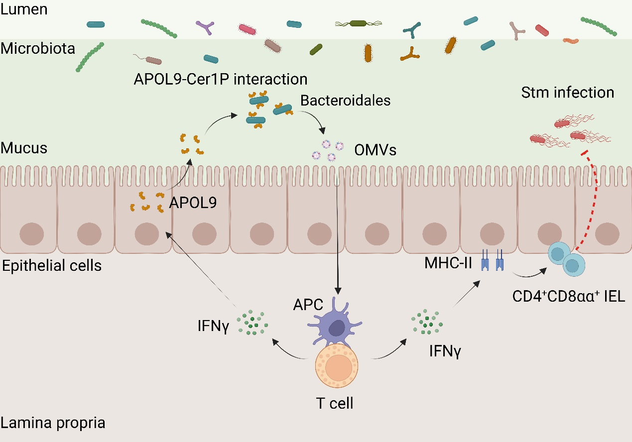 圖:新型載脂蛋白APOL9通過(guò)結(jié)合擬桿菌Cer1P分子誘導(dǎo)OMVs釋放并激活I(lǐng)FN-γ-MHC-II通路以增強(qiáng)腸道黏膜免疫
