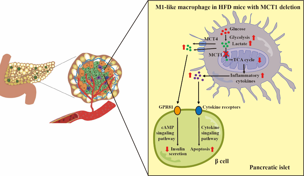 肥胖是21世紀(jì)最嚴(yán)峻的公共衛(wèi)生挑戰(zhàn)之一,也是糖尿病的重要誘因。 肥胖誘導(dǎo)的慢性低度炎癥重塑胰島免疫微環(huán)境,導(dǎo)致巨噬細(xì)胞異?;罨苯踊蜷g接損害胰島β細(xì)胞功能。作為先天免疫的核心效應(yīng)細(xì)胞,巨噬細(xì)胞通過其表型極化、炎性因子分泌及免疫互作網(wǎng)絡(luò),參與了胰島損傷和糖尿病進(jìn)程。多項研究表明,相較于非糖尿病人群,1型和2型糖尿病患者均表現(xiàn)出基礎(chǔ)血乳酸水平升高。值得注意的是,在2型糖尿病肥胖受試者中觀察到的血漿乳酸濃度,顯著高于非肥胖、非糖尿病的對照組個體。此外,糖耐量受損個體的血乳酸水平也顯著高于糖耐量正常者。然而,基礎(chǔ)血乳酸濃度的升高,是否是導(dǎo)致糖尿病的發(fā)病機(jī)制,尚不明確。