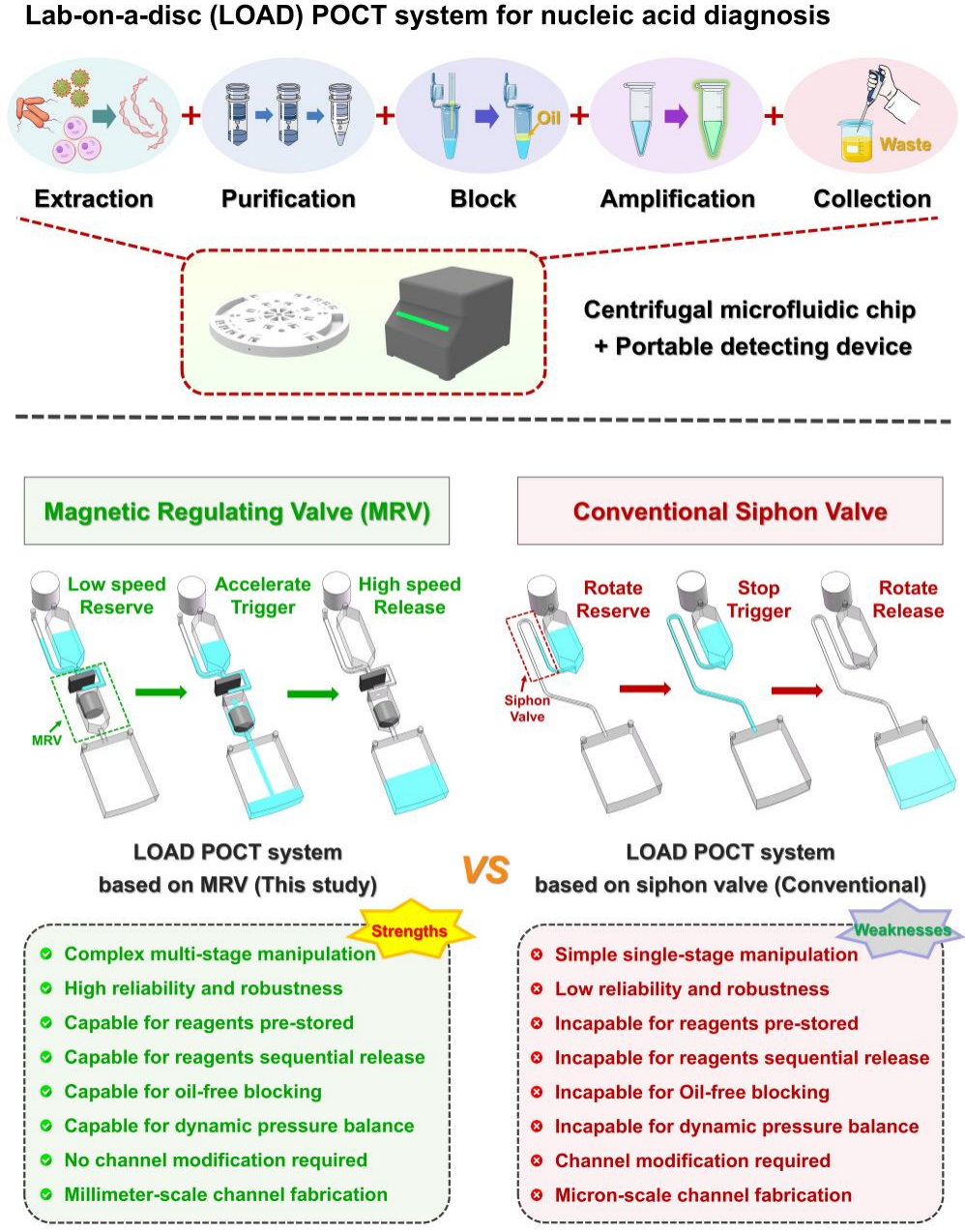 研究團(tuán)隊創(chuàng)新性地設(shè)計了用于離心微流控芯片的調(diào)節(jié)閥MRV,該閥由固定磁鐵、可動磁鐵、帶中心孔的硅膠墊及相應(yīng)腔室和通道組成,通過調(diào)節(jié)離心速度和磁鐵距離,實(shí)現(xiàn)程序化開關(guān)控制。MRV不僅能穩(wěn)定預(yù)存儲試劑,還可實(shí)現(xiàn)順序釋放、反應(yīng)系統(tǒng)封閉和動態(tài)氣壓平衡,避免了傳統(tǒng)虹吸閥帶來的失控及污染的風(fēng)險。團(tuán)隊進(jìn)一步基于功能化的MRV構(gòu)建了集成硅膜DNA提取、洗滌、洗脫和熒光環(huán)介導(dǎo)等溫擴(kuò)增(LAMP)檢測的一體化離心微流控芯片,配套開發(fā)了便攜式檢測設(shè)備,實(shí)現(xiàn)了對沙門氏菌、大腸桿菌O157:H7和金黃色葡萄球菌低至10 CFU/mL的同步靈敏檢測。