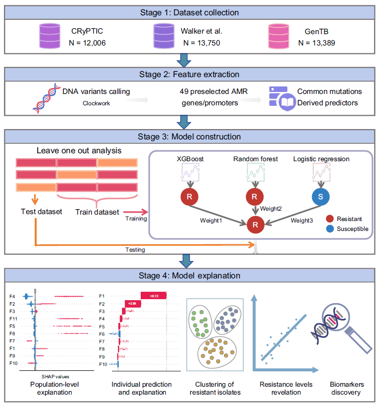 結(jié)核病是由結(jié)核分枝桿菌(Mycobacterium tuberculosis, MTB)引起的全球性細(xì)菌傳染病,2023年全球約有1060萬新發(fā)病例并導(dǎo)致130萬人死亡。耐藥結(jié)核病的出現(xiàn)顯著降低了治療成功率,進(jìn)一步加劇了結(jié)核病防控的難度。近年來,機(jī)器學(xué)習(xí)方法已被用于從基因組數(shù)據(jù)中識(shí)別與耐藥相關(guān)的復(fù)雜模式,但現(xiàn)有研究多停留在群體層面的統(tǒng)計(jì)關(guān)聯(lián),缺乏對(duì)單個(gè)菌株耐藥機(jī)制的可解釋性分析,而這一層面的解析對(duì)于理解特定突變?nèi)绾谓閷?dǎo)耐藥具有關(guān)鍵意義。因此,亟需能夠同時(shí)提供群體層面“全局解釋”和個(gè)體層面“局部解釋”的預(yù)測(cè)模型前者用于系統(tǒng)評(píng)估突變對(duì)耐藥性的整體貢獻(xiàn),后者用于揭示具體菌株耐藥表型的關(guān)鍵驅(qū)動(dòng)因素。