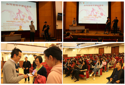 講座中,海峰以《梅花三弄》曲譜為引,介紹了中國(guó)古代音樂(lè)音符和西方音符在演奏上的區(qū)別,通過(guò)樂(lè)隊(duì)現(xiàn)場(chǎng)演奏薩克斯、吉他、蕭、塤等不同樂(lè)器,給聽(tīng)眾們帶來(lái)了不一樣的聲樂(lè)體驗(yàn)。在講座的尾聲,海峰及團(tuán)隊(duì)獨(dú)特創(chuàng)意,為在場(chǎng)聽(tīng)眾即興演唱演奏了兩曲分別具有中國(guó)意蘊(yùn)和現(xiàn)代氣息的曲目,不同文化元素的和諧交融激蕩出音樂(lè)的無(wú)限韻味。