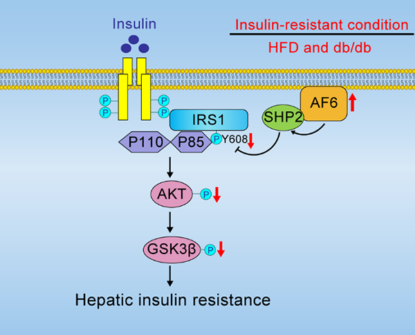 2019年5月24日,國(guó)際學(xué)術(shù)期刊Diabetes在線(xiàn)發(fā)表了中國(guó)科學(xué)院上海營(yíng)養(yǎng)與健康研究所詹麗杏研究組的研究成果“Polarity Protein AF6 Controls Hepatic Glucose Homeostasis and Insulin Sensitivity by Modulating IRS1/AKT Insulin Pathway in an SHP2-dependent Manner”。該研究發(fā)現(xiàn)極性蛋白AF6(afadin and MLLT4)能夠通過(guò)結(jié)合酪氨酸磷酸酶SHP2并且上調(diào)SHP2的活性從抑制IRS1/AKT通路,并證明糖尿病小鼠肝臟中敲減AF6蛋白表達(dá)可以有效提高胰島素敏感性并緩解胰島素抵抗。