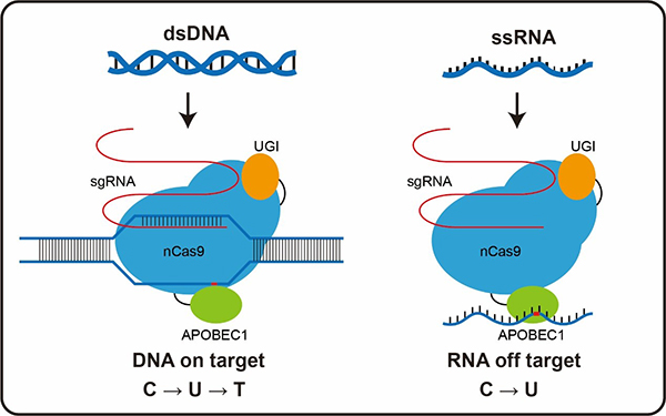 圖注單堿基編輯器BE3中的脫氨酶除了誘導(dǎo)DNA的胞嘧啶脫氨基轉(zhuǎn)變成T,還能在RNA上造成大范圍的脫靶。