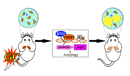 在本課題中,科研人員選擇了糖皮質(zhì)激素藥物的代表藥之一地塞米松進行研究。向小鼠注射地塞米松1周能夠顯著增加其全身脂肪和白色脂肪含量。科研人員發(fā)現(xiàn)地塞米松處理小鼠的棕色脂肪發(fā)生白色化:棕色脂肪組織中脂滴變大,脂質(zhì)含量增加,UCP1表達下降,氧耗減少。進一步研究表明,地塞米松能夠增加棕色脂肪細胞中自噬相關(guān)基因7(autophagy related 7,ATG7)的表達從而激活自噬作用。自噬是維持內(nèi)環(huán)境穩(wěn)態(tài)的重要方式。自噬過程中,受損的細胞器或細胞質(zhì)成分被雙層膜的自噬體包裹并運送至溶酶體中進行降解并重新利用。向小鼠體內(nèi)注射氯喹或利用病毒降低棕色脂肪ATG7表達能夠抑制自噬作用,阻止地塞米松誘導(dǎo)的棕色脂肪白色化以及全身脂肪含量的增加。進一步檢測發(fā)現(xiàn),地塞米松對于ATG7表達的調(diào)控依賴B cell translocation gene 1(BTG1)/ cAMP response element binding protein 1(CREB1)信號通路。脂肪組織特異性過表達BTG1小鼠棕色脂肪發(fā)生白色化,全身脂肪含量增加。利用病毒降低棕色脂肪BTG1表達能夠阻止地塞米松誘導(dǎo)的棕色脂肪白色化以及全身脂肪含量的增加。以上工作證明了抑制自噬作用可有效緩解糖皮質(zhì)激素誘導(dǎo)的肥胖,加深了人們對于糖皮質(zhì)激素作用機制以及棕色脂肪白色化過程的理解和認識。