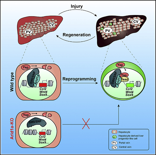 2019年7月3日,國(guó)際著名學(xué)術(shù)期刊Cell Stem Cell 在線發(fā)表了題為“A Homeostatic Arid1a-Dependent Permissive Chromatin State Licenses Hepatocyte Responsiveness to Liver-Injury-Associated YAP Signaling”的研究論文。該研究由中科院分子細(xì)胞科學(xué)卓越創(chuàng)新中心惠利健組與中科院上海營(yíng)養(yǎng)與健康研究所李亦學(xué)組合作完成。該研究發(fā)現(xiàn)染色體重塑調(diào)控蛋白Arid1a介導(dǎo)肝細(xì)胞重編程基因在正常的肝細(xì)胞中預(yù)打開(kāi),使肝細(xì)胞具有響應(yīng)損傷誘導(dǎo)的YAP信號(hào)而轉(zhuǎn)錄激活重編程基因的潛能,揭示了肝細(xì)胞去分化可塑性的分子基礎(chǔ)。