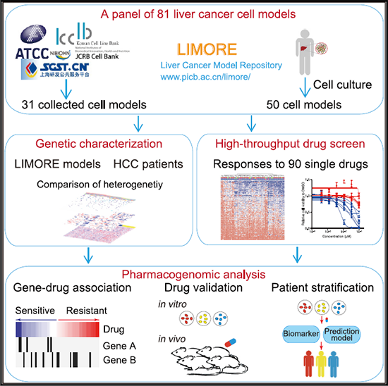 2019年8月1日,國(guó)際著名學(xué)術(shù)期刊Cancer Cell在線發(fā)表了中科院生物化學(xué)與細(xì)胞生物學(xué)研究所惠利健研究組、中國(guó)科學(xué)院上海營(yíng)養(yǎng)與健康研究所李亦學(xué)研究組、第二軍醫(yī)大學(xué)附屬東方肝膽外科醫(yī)院張海斌研究組以及南京大學(xué)醫(yī)學(xué)院附屬鼓樓醫(yī)院施曉雷合作的題為“A Pharmacogenomic Landscape in Human Liver Cancers”的研究論文。該工作報(bào)道了目前最大的肝癌細(xì)胞模型平臺(tái)和最詳細(xì)的肝癌細(xì)胞藥物基因組學(xué)。通過整合大規(guī)模測(cè)序和高通量藥物篩選數(shù)據(jù),研究人員建立了肝癌中基因組變異與藥物響應(yīng)的相關(guān)性,發(fā)現(xiàn)了新的治療靶點(diǎn)和分子標(biāo)志物(圖1)。