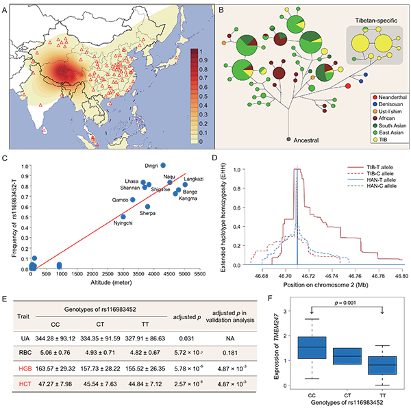 圖:藏族人群適應性變異TMEM247-rs116983452-T的群體遺傳解析和功能統(tǒng)計學分析