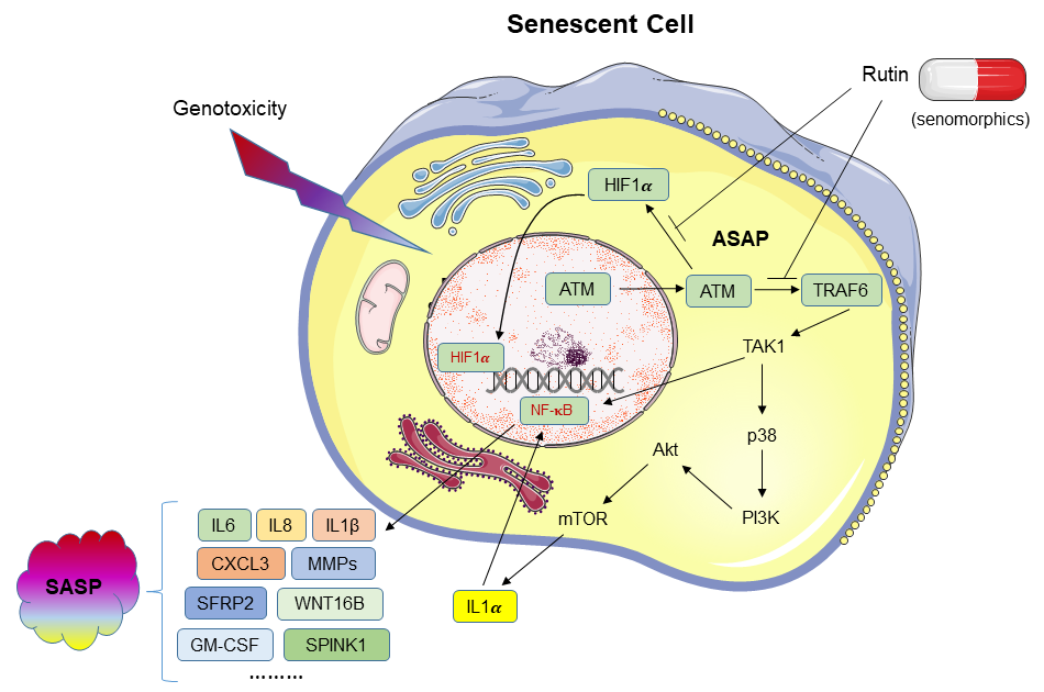 7月20日,國際學(xué)術(shù)期刊Aging Cell雜志在線發(fā)表了中國科學(xué)院上海營養(yǎng)與健康研究所孫宇研究組題為“Rutin is a potent senomorphic agent to target senescent cells and can improve chemotherapeutic efficacy”的研究成果,揭示了植物化學(xué)小分子Rutin,通過作用于衰老相關(guān)分泌表型SASP發(fā)生發(fā)展過程中的早期信號通路,特異性靶向干擾ATM與HIF1 、ATM與TRAF6之間的協(xié)同互作,從而使得衰老細胞失去SASP這一經(jīng)典特征。