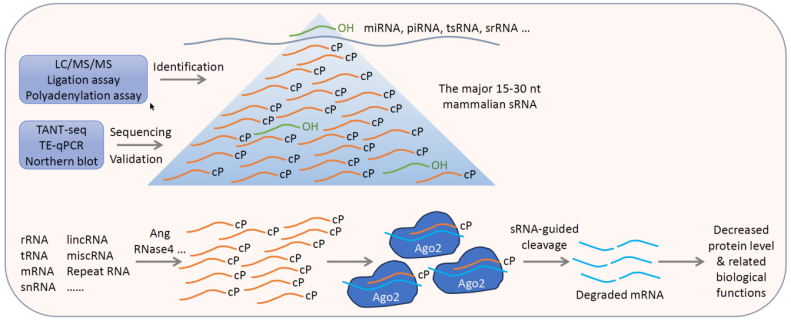 哺乳動物15-30nt長度的小RNA主要為sRNA-cP,但這些小RNA究竟是在分離純化RNA過程中隨機(jī)降解產(chǎn)生的,還是在細(xì)胞內(nèi)特異性加工產(chǎn)生的還有待解答。通過對sRNA-cP的末端序列特征分析發(fā)現(xiàn),其3’末端主要為嘧啶堿基,而5’末端主要為嘌呤堿基。根據(jù)已知的細(xì)胞內(nèi)各種RNA內(nèi)切酶的序列識別特征,通過逐步的體外篩選以及后續(xù)的基因敲除和過表達(dá)等技術(shù)發(fā)現(xiàn),ANG和RNase4介導(dǎo)了部分sRNA-cP的產(chǎn)生。