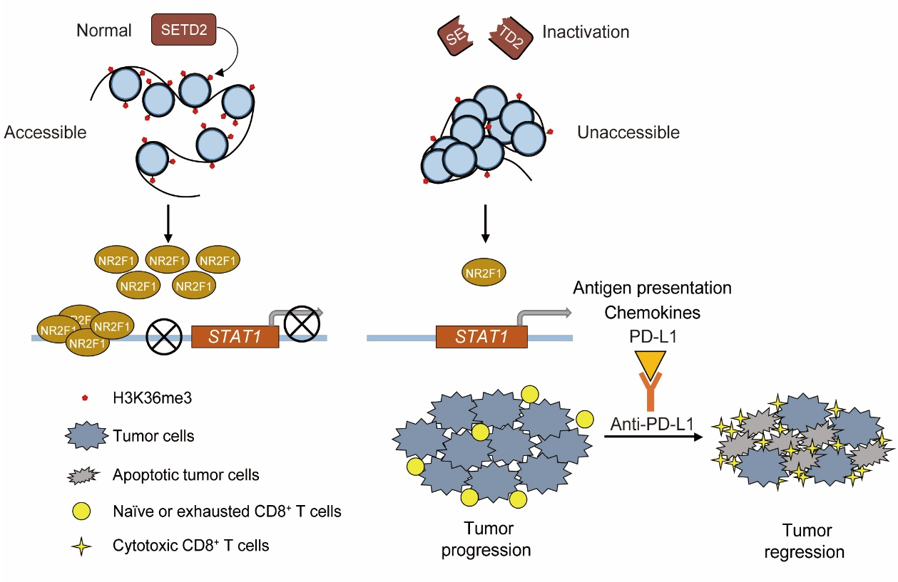 (左):SETD2正常發(fā)揮作用,染色質(zhì)開放性強,NR2F1表達水平高,抑制STAT1轉(zhuǎn)錄激活。(右):SETD2失活時染色質(zhì)開放性差,NR2F1表達水平低,STAT1轉(zhuǎn)錄增強。重塑腫瘤免疫微環(huán)境,增強腫瘤細胞對免疫檢查點阻斷治療的敏感性。