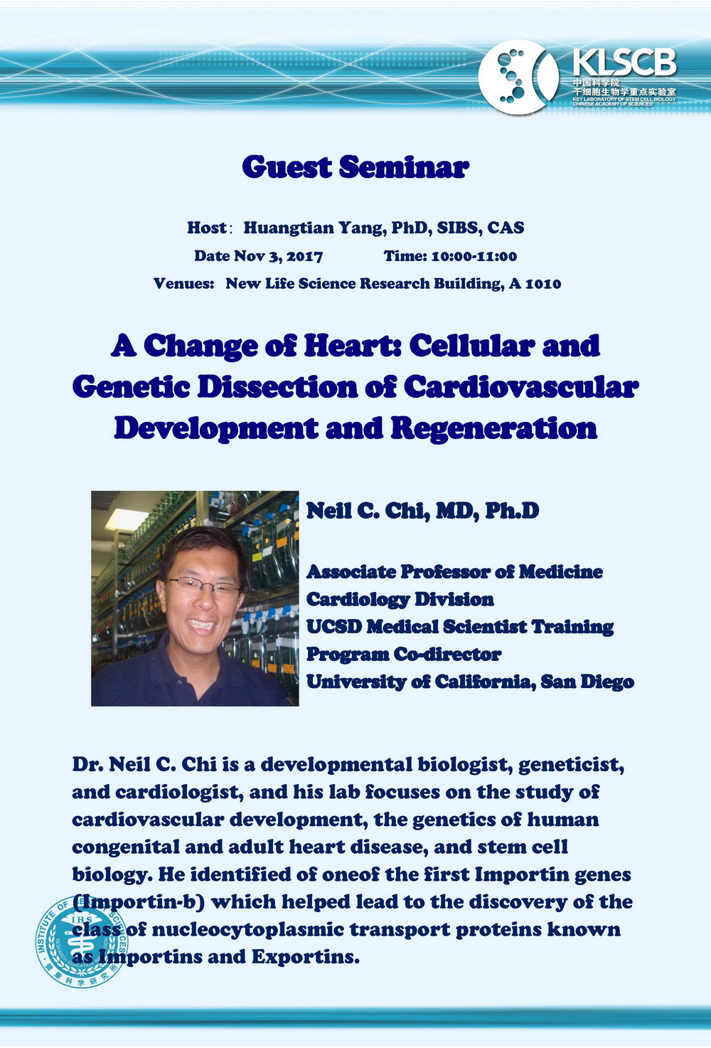 中科院干細(xì)胞生物學(xué)重點(diǎn)實(shí)驗(yàn)室學(xué)術(shù)報(bào)告:A Change of Heart: Cellular and Genetic Dissection of Cardiovascular Development and Regeneration