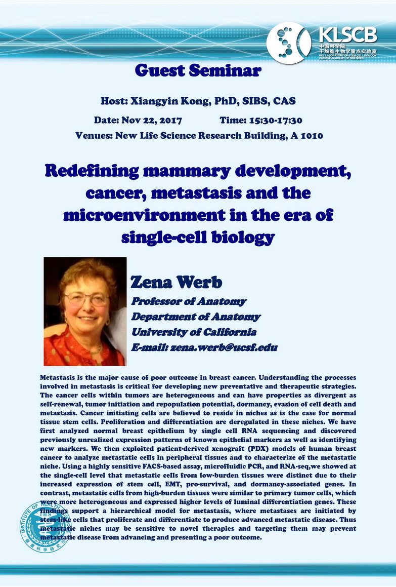 中科院干細(xì)胞生物學(xué)重點(diǎn)實(shí)驗(yàn)室學(xué)術(shù)報(bào)告:Redefining mammary development, cancer, metastasis and the microenvironment in the era of single-cell biology
