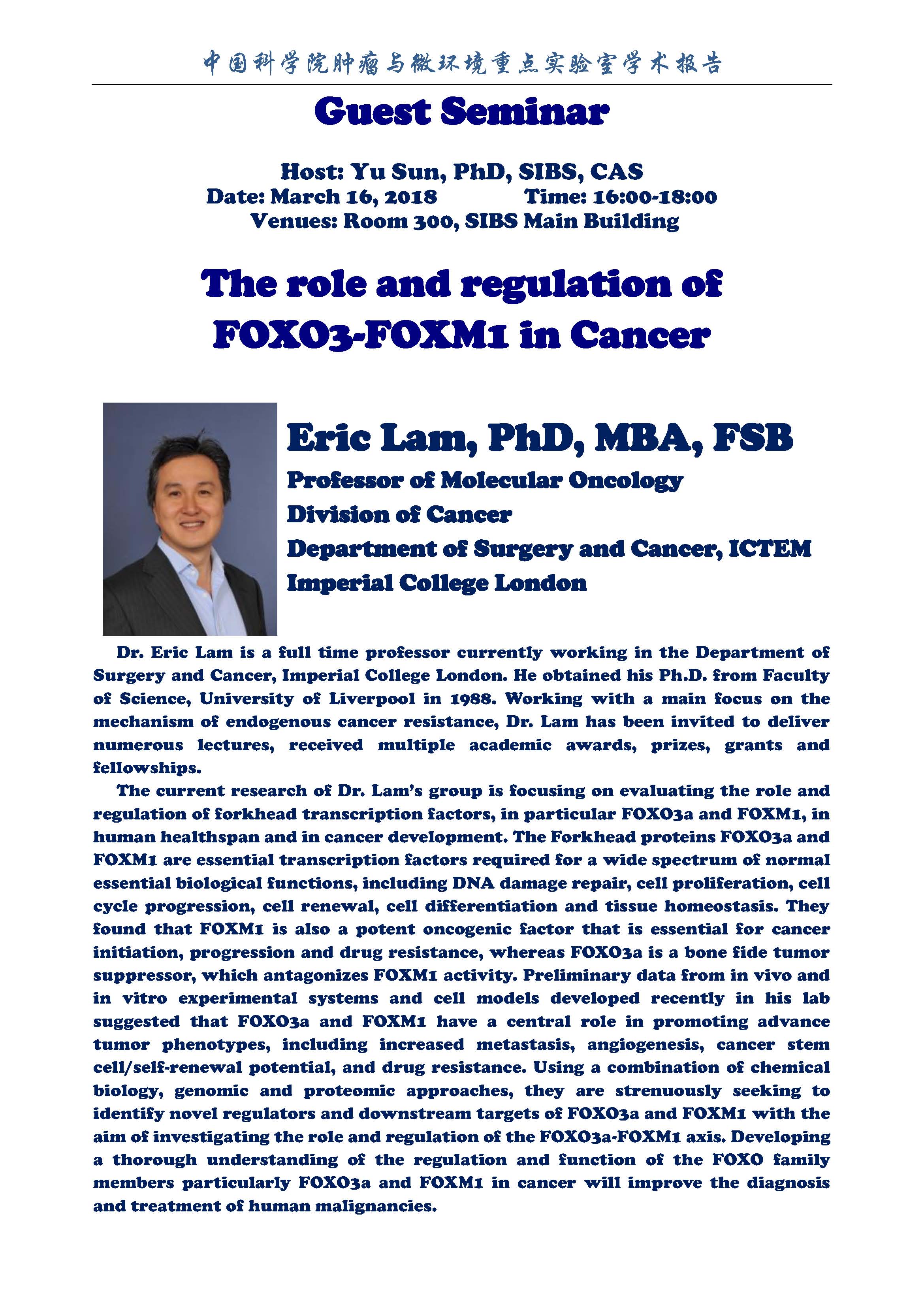 中科院腫瘤與微環(huán)境重點實驗室學(xué)術(shù)報告:The role and regulation of FOXO3-FOXM1 in Cancer