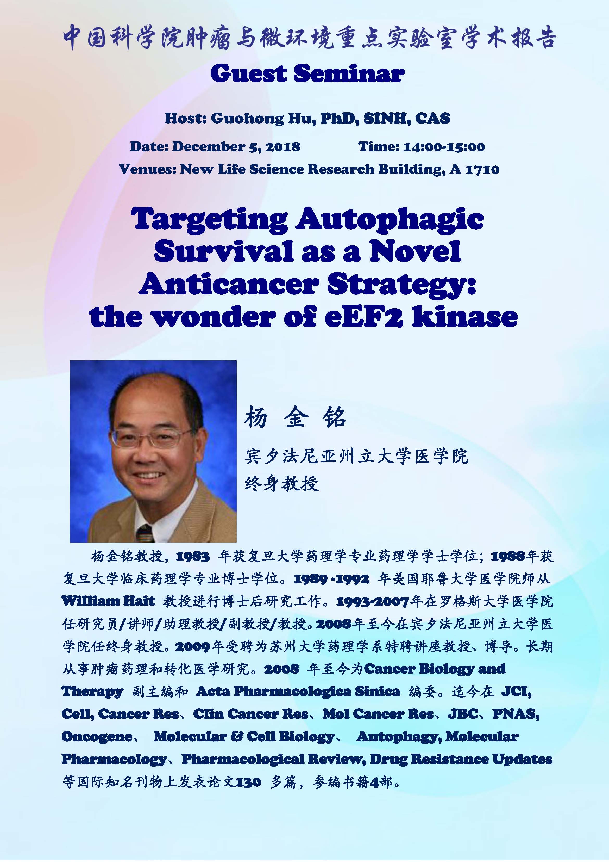 中科院腫瘤與微環(huán)境重點(diǎn)實(shí)驗(yàn)室學(xué)術(shù)報(bào)告:Targeting Autophagic Survival as a Novel Anticancer Strategy:the wonder of eEF2 kinase