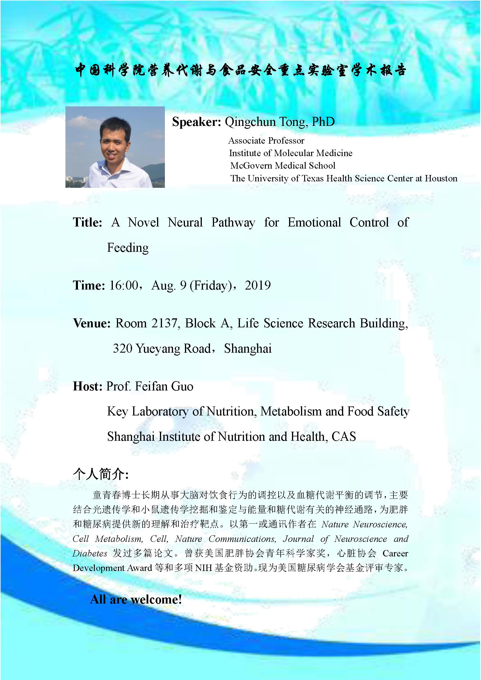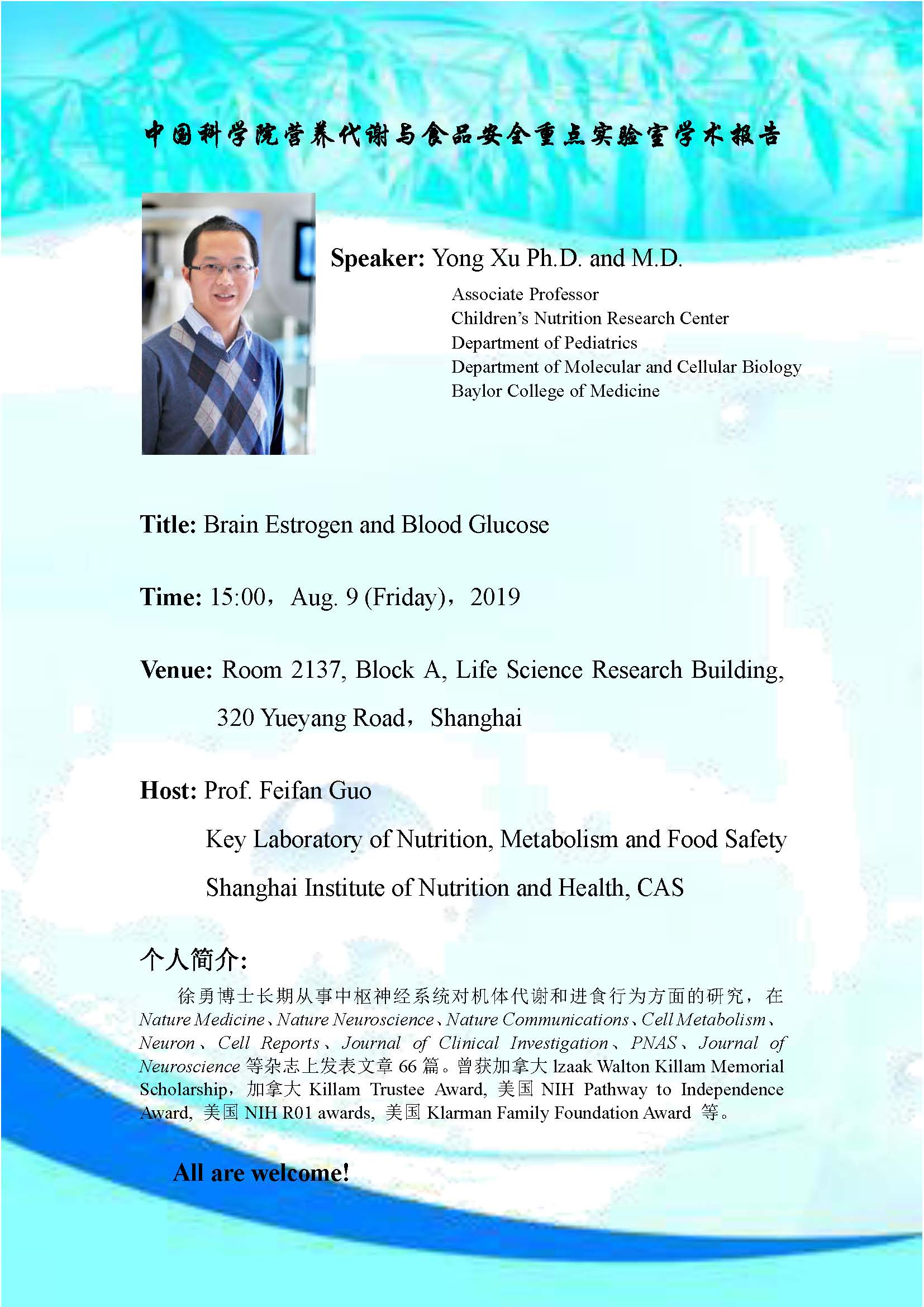 中國科學院營養(yǎng)代謝與食品安全重點實驗室學術報告:Brain Estrogen and Blood Glucose & A Novel Neural Pathway for Emotional Control of Feeding