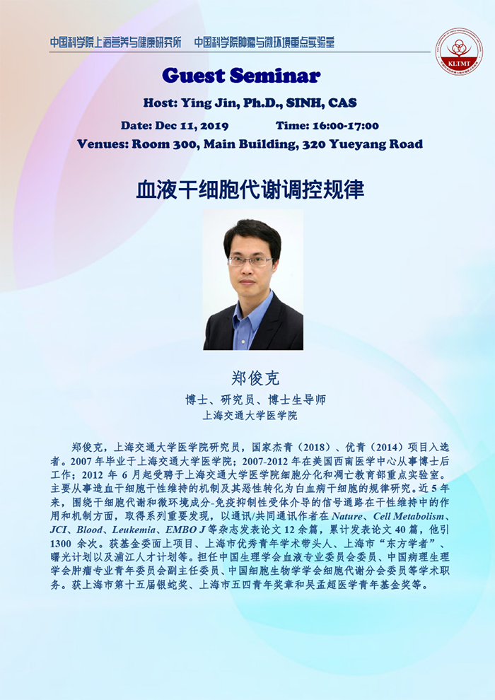 中科院上海營養(yǎng)與健康研究所固定學(xué)術(shù)報(bào)告:血液干細(xì)胞代謝調(diào)控規(guī)律