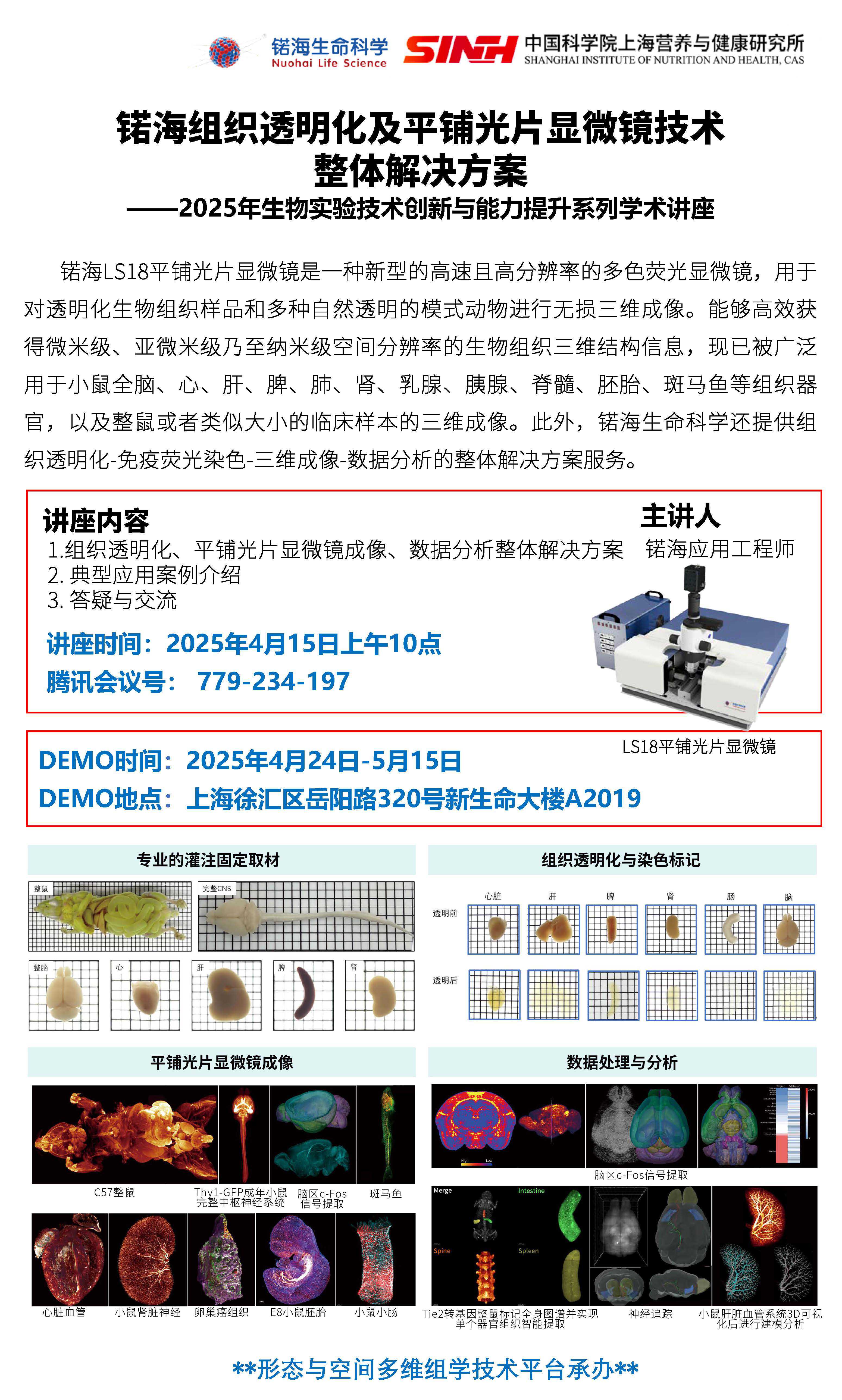 4月15日|“锘海組織透明化及平鋪光片顯微鏡技術整體解決方案”線上講座-2025年生物實驗技術創(chuàng)新與能力提升系列學術講座