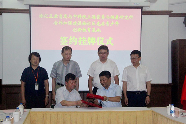 8月14日,徐匯區(qū)教育局與中科院上海營(yíng)養(yǎng)與健康研究所舉行合作加強(qiáng)建設(shè)光啟青少年創(chuàng)新教育基地簽約掛牌儀式。徐匯區(qū)教育局局長(zhǎng)王彤,調(diào)研員于東航,副局長(zhǎng)陸軍及相關(guān)領(lǐng)導(dǎo),上海生科院黨委書記蔡澎,副院長(zhǎng)廖侃,紀(jì)委書記孔巍及營(yíng)養(yǎng)與健康研究所部分職能部門負(fù)責(zé)人、導(dǎo)師代表共同出席了簽約掛牌儀式。