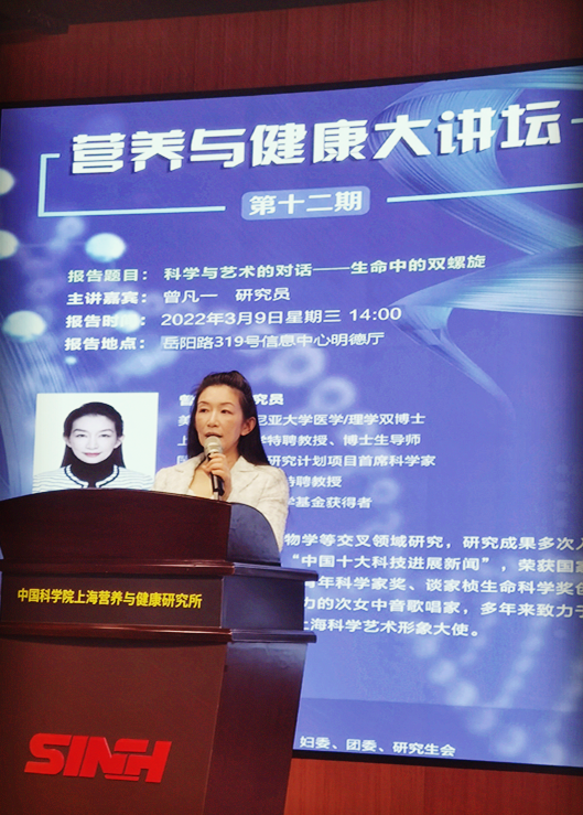 為豐富中國科學(xué)院上海營養(yǎng)與健康研究所師生文化生活,3月9日,營養(yǎng)與健康所黨委、工會、婦委、團(tuán)委、研究生會聯(lián)合舉辦第12期營養(yǎng)與健康大講壇活動。美國賓夕法尼亞大學(xué)醫(yī)學(xué)/理學(xué)雙博士、上海交通大學(xué)特聘教授、博士生導(dǎo)師曾凡一應(yīng)邀參加此次活動,為大家做了題為“科學(xué)與藝術(shù)的對話——生命中的雙螺旋”的專題報告。本次報告由營養(yǎng)與健康所黨委副書記、紀(jì)委書記曹永主持。