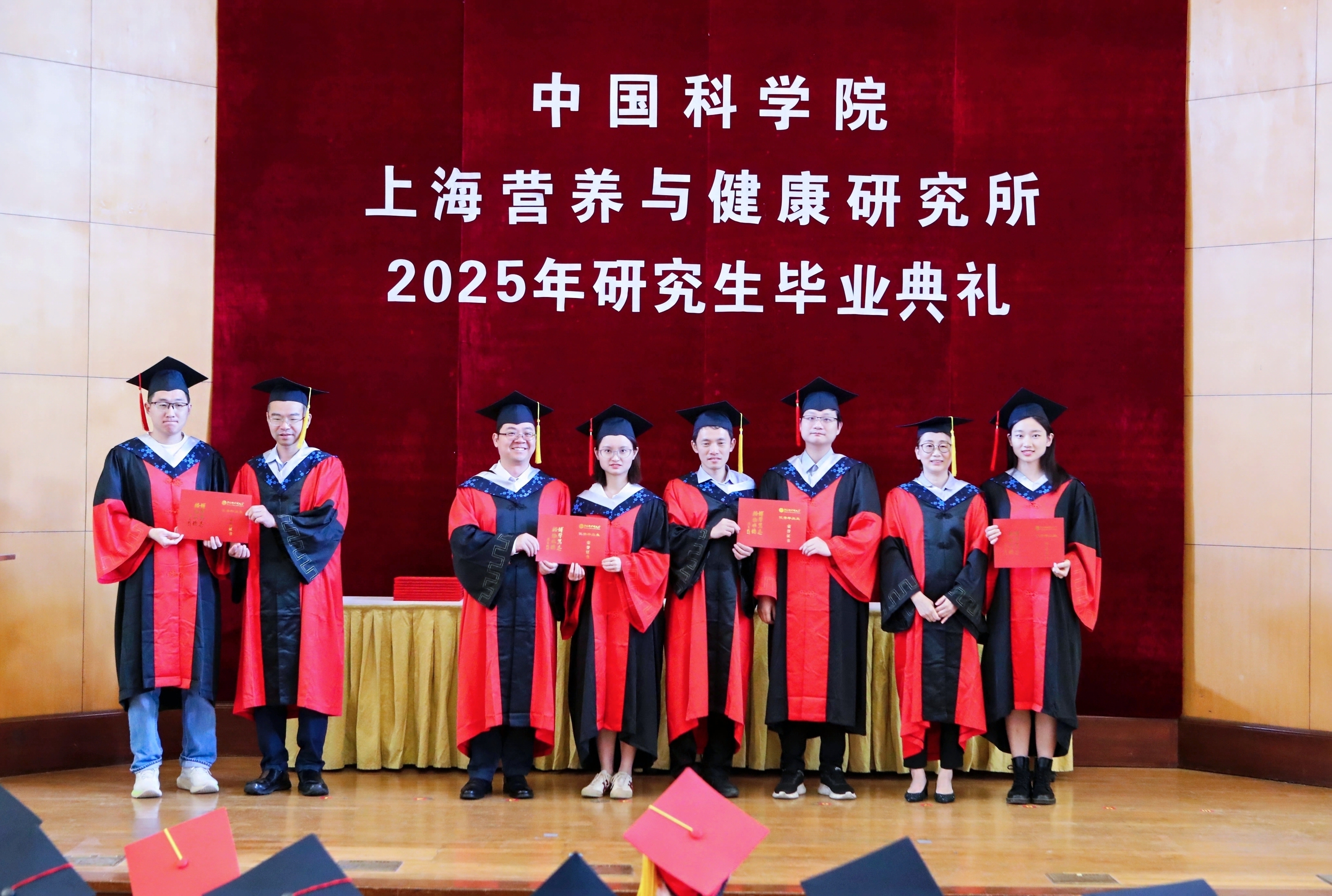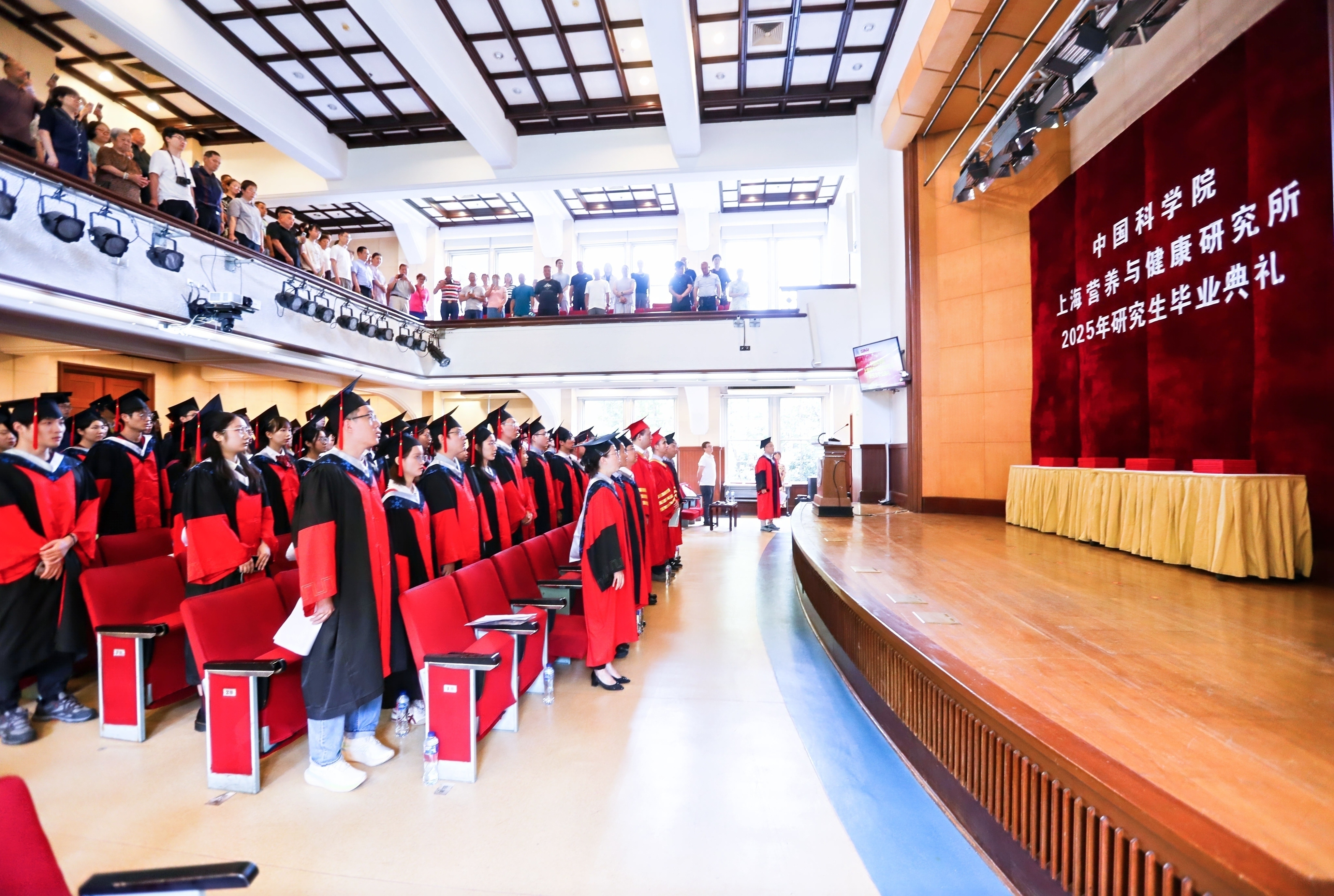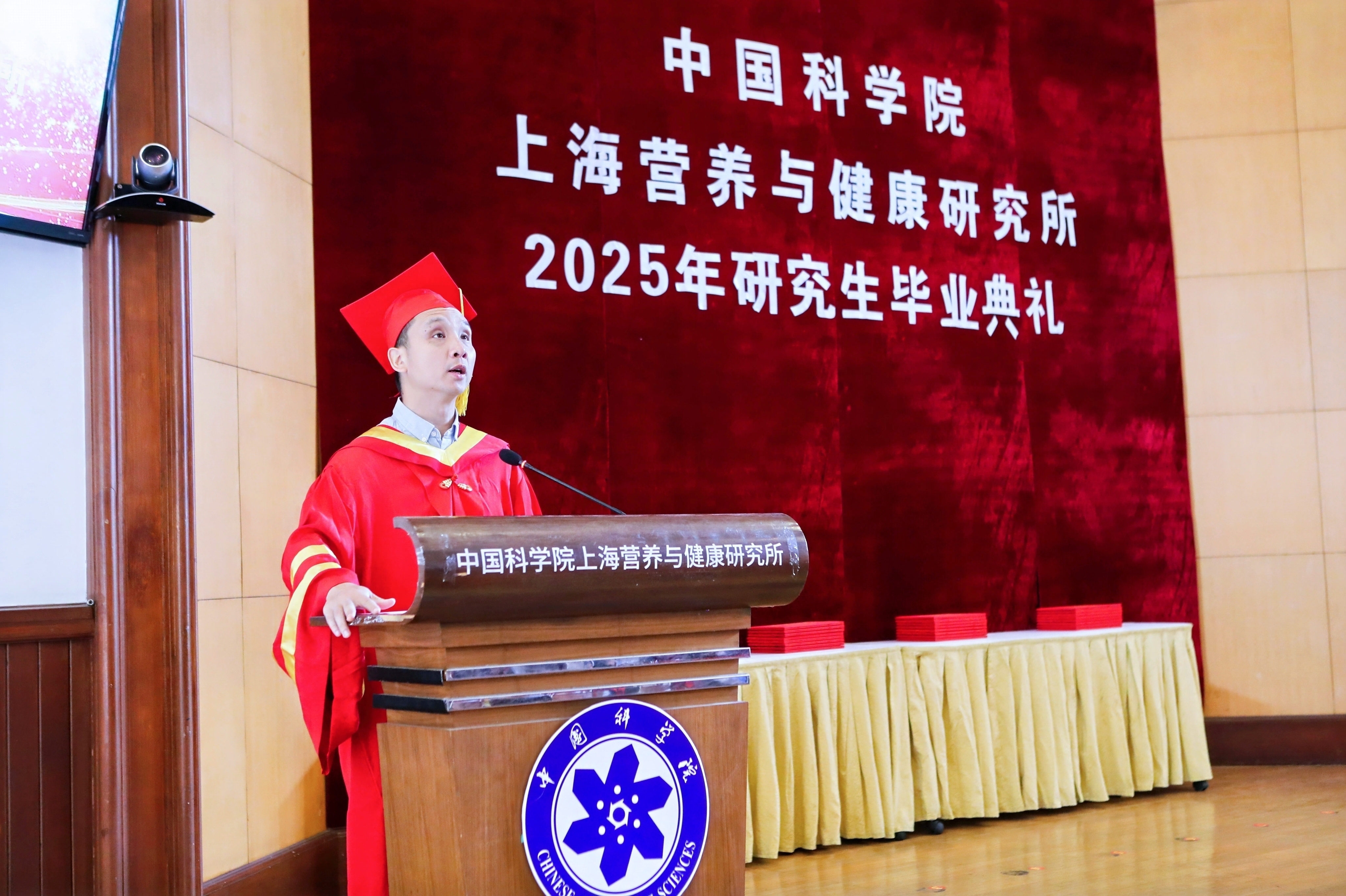 6月20日,中國科學(xué)院上海營養(yǎng)與健康研究所2025年研究生畢業(yè)典禮在生科大樓報告廳舉行。營養(yǎng)與健康所所長、黨委副書記汪思佳,副所長、學(xué)位評定委員會主席胡國宏,所務(wù)委員、學(xué)位評定委員會副主席邵振,學(xué)位評定委員會委員孔祥銀、王躍祥,導(dǎo)師代表熊燕、黃濤、王振,2025屆畢業(yè)生與畢業(yè)生親友、研究生處教育管理干部等100余人齊聚一堂,共同參與了這一盛典。畢業(yè)典禮由邵振主持。