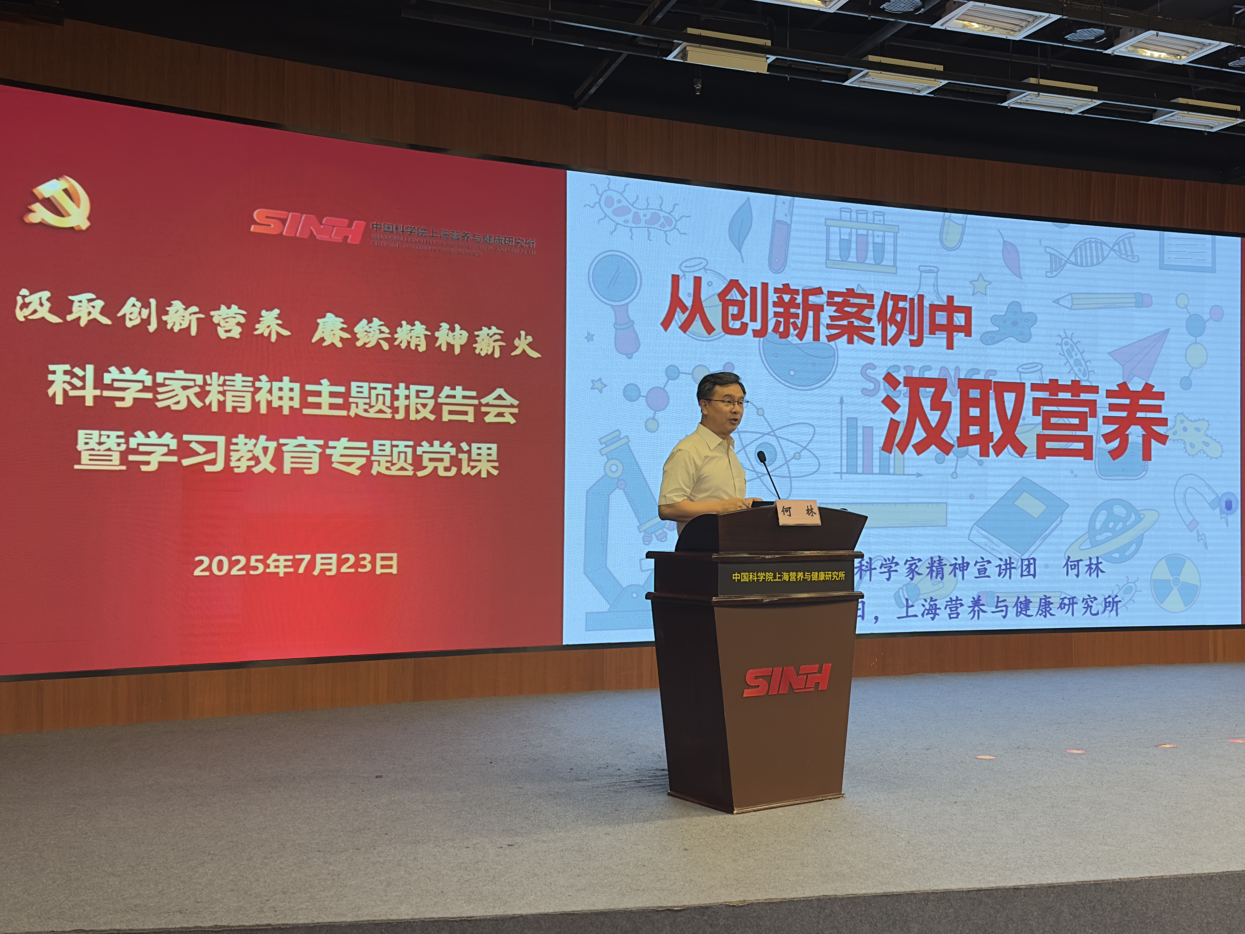 7月23日,中國科學院上海營養(yǎng)與健康研究所舉辦“汲取創(chuàng)新營養(yǎng) 賡續(xù)精神薪火”科學家精神主題報告會暨學習教育專題黨課,特邀中國科學院科學家精神宣講團成員何林作專題報告。研究所各黨(總)支部書記、職能部門負責人、科研骨干及青年代表等百余人參加學習,黨委書記瞿榮輝主持報告會。