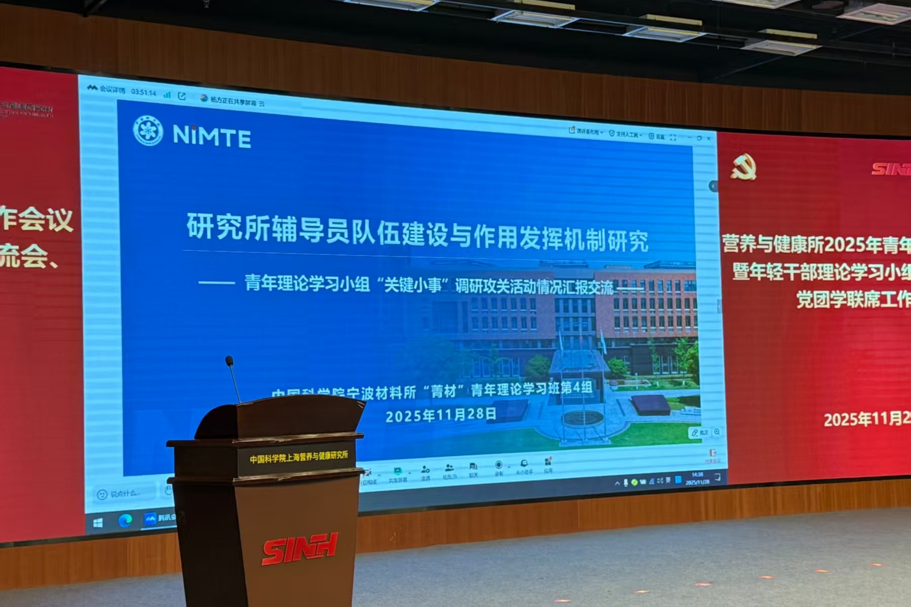 中國科學(xué)院寧波材料技術(shù)與工程研究所研究生處副處長楊方受邀就輔導(dǎo)員隊伍建設(shè)與作用發(fā)揮機制研究作了分享交流;中國科學(xué)院上海應(yīng)用物理研究所鄒春燕研究員就青年科研人員參與重大任務(wù)情況作工作交流;營養(yǎng)與健康所信息中心第二黨支部書記李禎祺同志圍繞如何激發(fā)科技青年創(chuàng)新內(nèi)驅(qū)力作了調(diào)研報告。