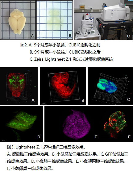 本平臺(tái)技術(shù)人員熟練掌握平臺(tái)現(xiàn)有儀器設(shè)備,并善于探索適合特殊實(shí)驗(yàn)的條件和方法,能對(duì)各類實(shí)驗(yàn)提供很好的實(shí)驗(yàn)幫助。并且該平臺(tái)已成熟掌握CUBIC組織透明化的方法(圖2)以及快速成像和三維重構(gòu)的方法(圖3),能夠在透明化全腦以及透明化大樣本(如:胚胎,肌肉,心臟等)的制樣和成像方面提供強(qiáng)有力的服務(wù)與支持。同時(shí),本平臺(tái)技術(shù)人員在長(zhǎng)時(shí)程多樣本的活體成像方面以及雙光子二次諧波成像方面都能做到很好的技術(shù)支撐。
