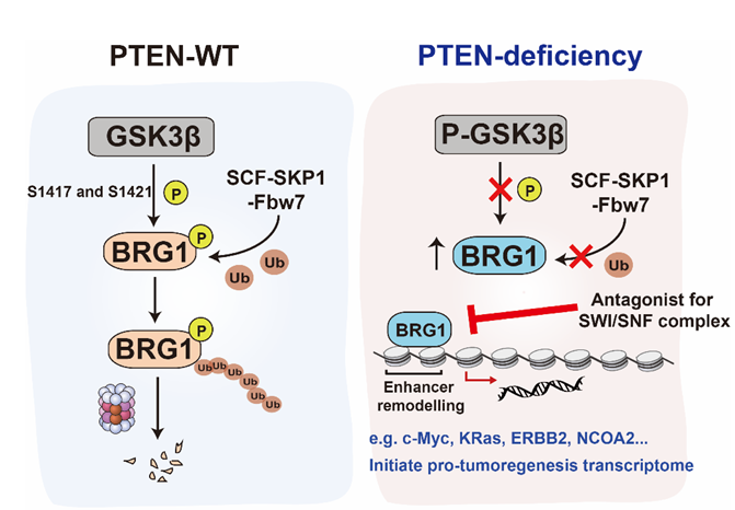 PTEN缺失以及由此導(dǎo)致的AKT信號(hào)通路的過(guò)度激活是導(dǎo)致前列腺癌發(fā)生發(fā)展的重要原因之一。然而PTEN在患者中低表達(dá)或者失活因而無(wú)法直接靶向用藥;同時(shí)目前臨床上針對(duì)PI3K-AKT信號(hào)通路的靶向藥效果并不理想。因此本課題希望發(fā)現(xiàn)潛在的治療靶點(diǎn)實(shí)現(xiàn)對(duì)PTEN缺失前列腺癌的有效治療。鑒于PTEN缺失會(huì)導(dǎo)致細(xì)胞特定表觀遺傳因子異常改變,我們通過(guò)表觀遺傳因子篩選的方法發(fā)現(xiàn)在PTEN缺失前列腺腫瘤細(xì)胞中抑制BRG1可以導(dǎo)致前列腺腫瘤細(xì)胞的協(xié)同致死。轉(zhuǎn)基因小鼠和類器官培養(yǎng)模型的結(jié)果證明PTEN缺失前列腺腫瘤細(xì)胞對(duì)于BRG1的特異性依賴。分子機(jī)制的研究揭示了PTEN缺失可以通過(guò)抑制AKT-GSK3 -FBXW7通路增強(qiáng)BRG1的蛋白穩(wěn)定性,上調(diào)BRG1的表達(dá)。在PTEN缺失前列腺腫瘤細(xì)胞中,BRG1進(jìn)而重塑染色質(zhì)構(gòu)象,開啟一系列基因的表達(dá),造成腫瘤細(xì)胞對(duì)BRG1的高度依賴。因此使用BRG1抑制劑可以特異性抑制PTEN缺失前列腺腫瘤的進(jìn)展。