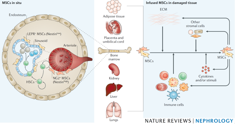 MSCs最早在骨髓中發(fā)現(xiàn),作為干細(xì)胞巢的組成部分,具有調(diào)控造血干細(xì)胞自我更新、增殖和分化的能力,并具有向脂肪細(xì)胞和成骨、成軟骨細(xì)胞分化的潛能。隨后的研究表明,MSCs在臍帶、脂肪、肺臟、腎臟等多種器官中均有存在,作為基質(zhì)細(xì)胞維持器官內(nèi)環(huán)境穩(wěn)態(tài)。MSCs能夠廣泛、活躍地與微環(huán)境中的組織細(xì)胞、干細(xì)胞、免疫細(xì)胞以及細(xì)胞外基質(zhì)等組分交互作用,在生理病理?xiàng)l件下,調(diào)控疾病的進(jìn)展和修復(fù)。MSCs移植在許多炎癥性和損傷性疾病,如移植物抗宿主反應(yīng)、多發(fā)性硬化、心肌缺血等疾病中均顯示出了良好的治療效果。目前,美國國立衛(wèi)生研究院ClinicalTrials.gov數(shù)據(jù)庫上登記的MSCs相關(guān)臨床實(shí)驗(yàn)已經(jīng)超過700例。